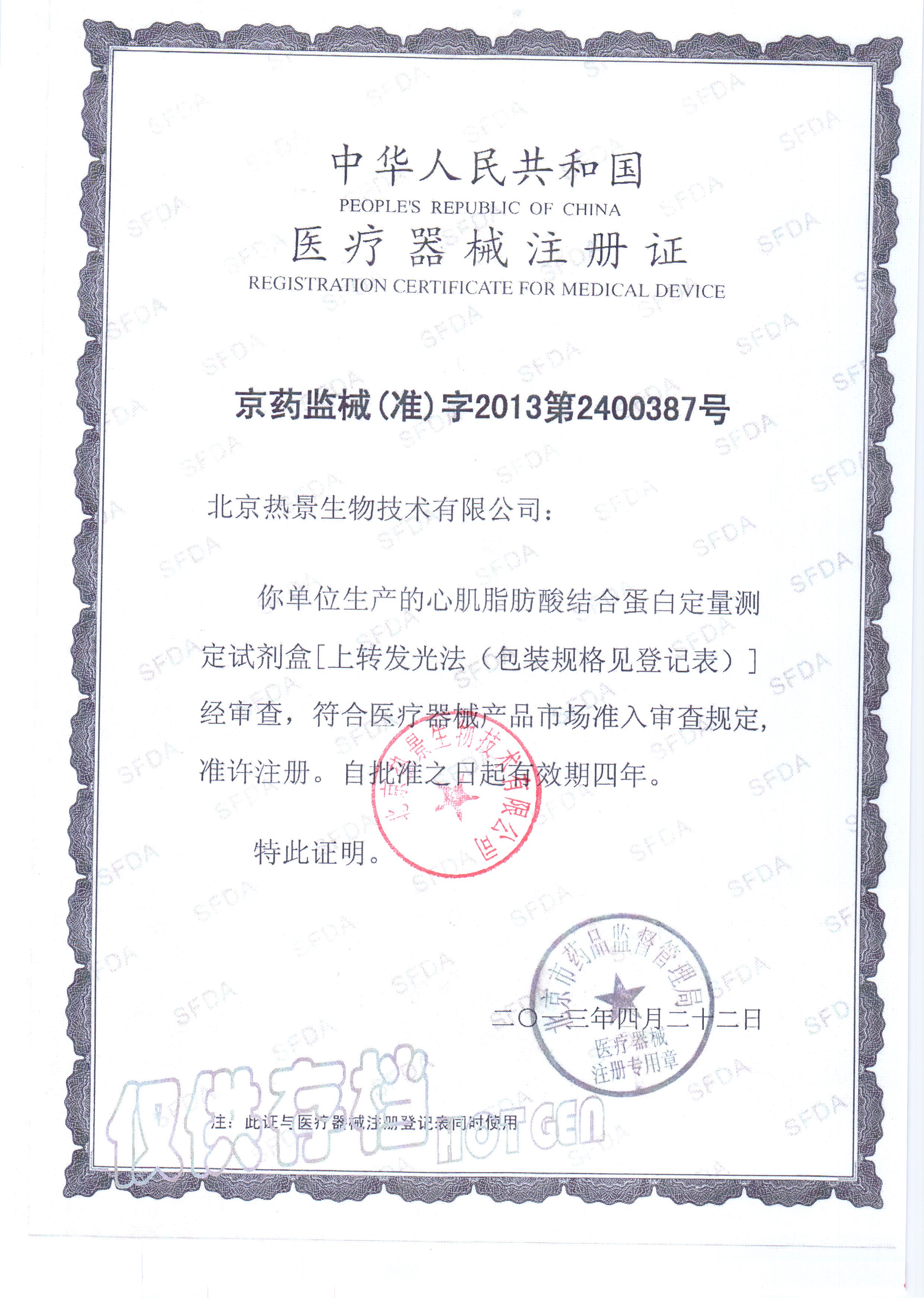 通過多人的共同努力,熱景生物心肌脂肪酸結(jié)合蛋白定量測定試劑盒(上轉(zhuǎn)發(fā)光法)獲得醫(yī)療器械注冊證,注冊證號:京藥監(jiān)械(準)字2013第2400387號。