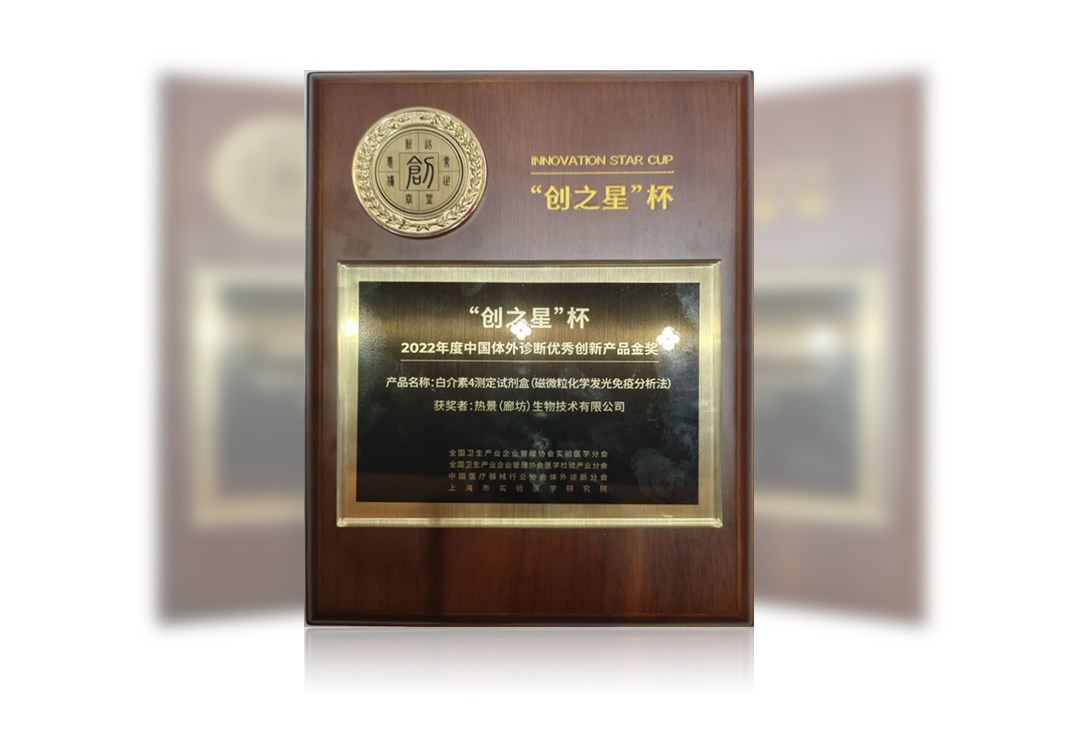 在5月27日“創之聲”第八屆中國實驗醫學大會現場,熱景生物旗下熱景(廊坊)生物技術有限公司生產的專有特色細胞因子系列產品,榮獲2022年度“創之星”杯中國體外診斷優秀創新產品金獎。