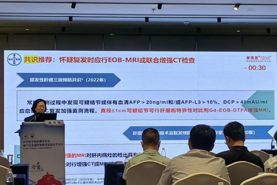 河北醫科大學第三醫院南月敏教授作“積極治療,從新出發-從新指南看慢乙肝初治患者的優化治療策略”學術報告,在講到共識推薦:懷疑復發時應行EOB-MRI或聯合增強CT檢查時,指出常規檢測過程中發現可疑結節或伴有血清AFP>20ng/ml和AFP-L3>10%、DCP>40mAU/ml,應啟動HCC復發加強監測流程。