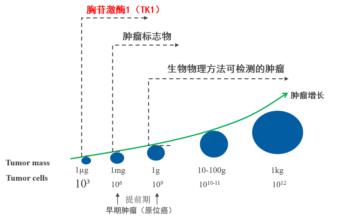 胸苷激酶 1(thymidine kinase 1,TK1)是細胞增殖過程中 DNA 合成的關鍵酶之一,它催化胸苷(Tdr)磷酸化為胸苷一磷酸(TMP)進而形成胸苷三磷酸(TTP),從而參與 DNA 合成。在細胞周期中 TK1 在 G1 期晚期開始升高,S 期達到最高,至 G2 期開始下降,TK1 水平的升高和 DNA 合成呈正相關,對于細胞異常增殖類病變,DNA 合成劇增會導致 TK1 水平的異常升高。血清 TK1 含量的變化在細胞異常增殖類疾病風險和進程評估方面有著重要的應用價值。臨床上監測 TK1 血清濃度變化可以提示人體細胞增殖的動態情況。