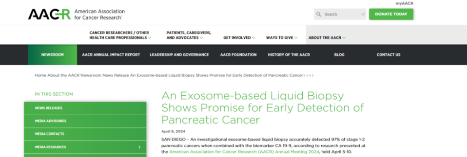 根據2024美國癌癥研究協會(AACR)年會上發表的一項研究,在結合生物標志物CA 19-9的情況下,基于外泌體的液體活檢可準確檢測出97%的Ⅰ~Ⅱ期胰腺癌。