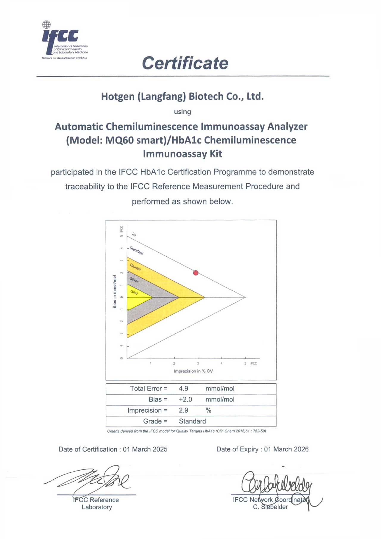 近日,熱景生物單人份化學發光免疫分析儀MQ60 Smart 檢測HbA1c獲得國際臨床化學與實驗室醫學聯合會(IFCC)的認證,確保了其檢測結果的標準化、規范化和國際化水平。同時意味著MQ60 Smart 檢測HbA1c的檢測結果具有國際認可的質量和可靠性。