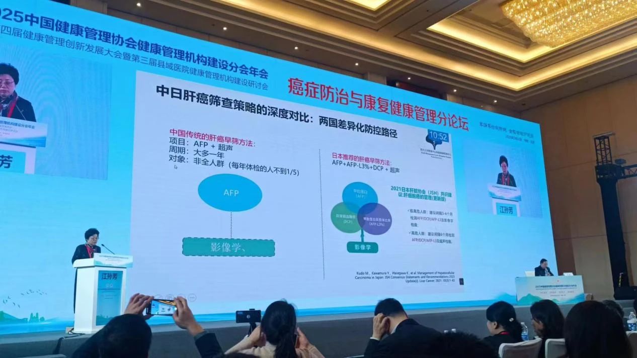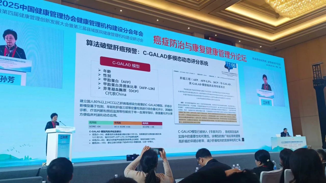 在《癌癥防治與康復健康管理》專項論壇中,復旦大學附屬中山醫院江孫芳主任受邀發表專題報告《健康管理中心-社區聯動 助力肝癌早篩》,從臨床實踐與科研結合的角度,系統闡述了C-GALAD模型在肝癌早期篩查中的創新應用價值。