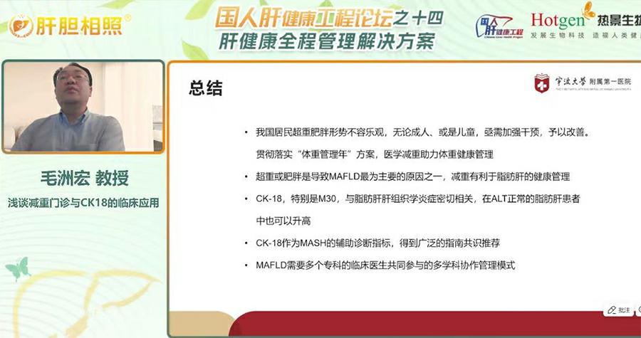 寧波大學(xué)附屬第一醫(yī)院內(nèi)分泌科毛洲宏教授在會(huì)議上圍繞“減重門診與CK18的臨床應(yīng)用”作專題報(bào)告,強(qiáng)調(diào)國(guó)家衛(wèi)健委“體重管理年”政策推動(dòng)下,醫(yī)療機(jī)構(gòu)需加強(qiáng)減重門診建設(shè),為超重及肥胖人群提供專業(yè)化服務(wù)。毛教授也以本院“肥胖俱樂部”在開設(shè)近十年的真實(shí)經(jīng)驗(yàn),給我們科普了減重管理的重要性。目前,我國(guó)超重肥胖形勢(shì)嚴(yán)峻,超50%成人存在體重異常,肥胖與代謝相關(guān)脂肪性肝病(MAFLD)密切相關(guān),約20% MAFLD患者可能進(jìn)展為脂肪性肝炎(MASH),T2DM患者合并MAFLD比例高達(dá)65.04%。毛教授指出,傳統(tǒng)檢測(cè)手段如ALT、B超在早期診斷MASH及纖維化中存在局限性,而細(xì)胞角蛋白18(CK-18)片段作為新型生物標(biāo)志物,通過M30/M65片段可無創(chuàng)評(píng)估肝細(xì)胞凋亡與壞死,其敏感性與特異性顯著優(yōu)于傳統(tǒng)指標(biāo)。此外,MAFLD需多學(xué)科協(xié)作管理,結(jié)合減重、改善代謝、抗纖維化等綜合干預(yù)措施,定期監(jiān)測(cè)高危人群。毛教授總結(jié)稱,CK18的應(yīng)用將推動(dòng)MAFLD精準(zhǔn)診療,而政策支持與多學(xué)科模式普及,為肥胖及相關(guān)代謝疾病防控注入新動(dòng)力。