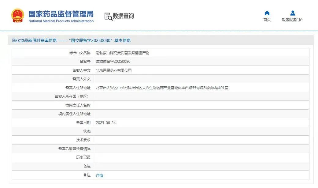 中國北京,2025年6月24日——熱景生物(股票代碼:688068)孵化的北京禹景藥業有限公司(以下簡稱“禹景藥業”)自主研發的Akkermansia muciniphila YG2602(AKK YG2602)成功通過國家藥品監督管理局化妝品新原料備案(備案號:國妝原備字20250080),成為全球首個獲批的AKK菌化妝品新原料
