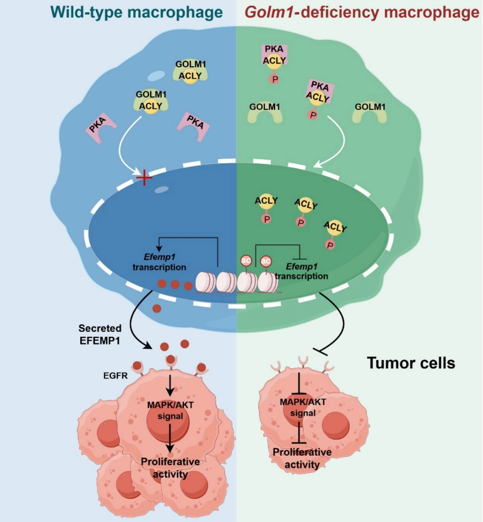 研究結果表明,GOLM1 在腫瘤相關巨噬細胞中高表達;巨噬細胞中 GOLM1 缺失可抑制腫瘤,并促進代謝重編程;本研究中首次證實,GOLM1 可與 ACLY 直接結合并干擾其在巨噬細胞中的功能。GOLM1 與 ACLY 的結合會阻礙上游蛋白激酶 A(PKA)介導的 ACLY 在絲氨酸 455 位點的磷酸化,進而導致 ACLY 活性降低;而敲除巨噬細胞中的 GOLM1基因會增強細胞核內 ACLY 的磷酸化水平,從而促進組蛋白 H3 第 27 位賴氨酸的乙?;℉3K27ac)。多組學分析表明,H3K27 的乙?;缴邥M一步抑制巨噬細胞中細胞外基質(ECM)蛋白 EFEMP1 的轉錄與釋放,進而抑制腫瘤細胞中 EGFR 的活性及其下游 MAPK 和 AKT 信號通路,最終抑制腫瘤的增殖活性。本研究首次闡明,在巨噬細胞中GOLM1通過 EFEMP1/EGFR 細胞間信號傳導,影響 ACLY 介導的表觀遺傳調控,從而調控腫瘤增殖。這些發現提示,腫瘤相關巨噬細胞(TAMs)中的 GOLM1-ACLY 軸有望成為癌癥治療的潛在靶點。