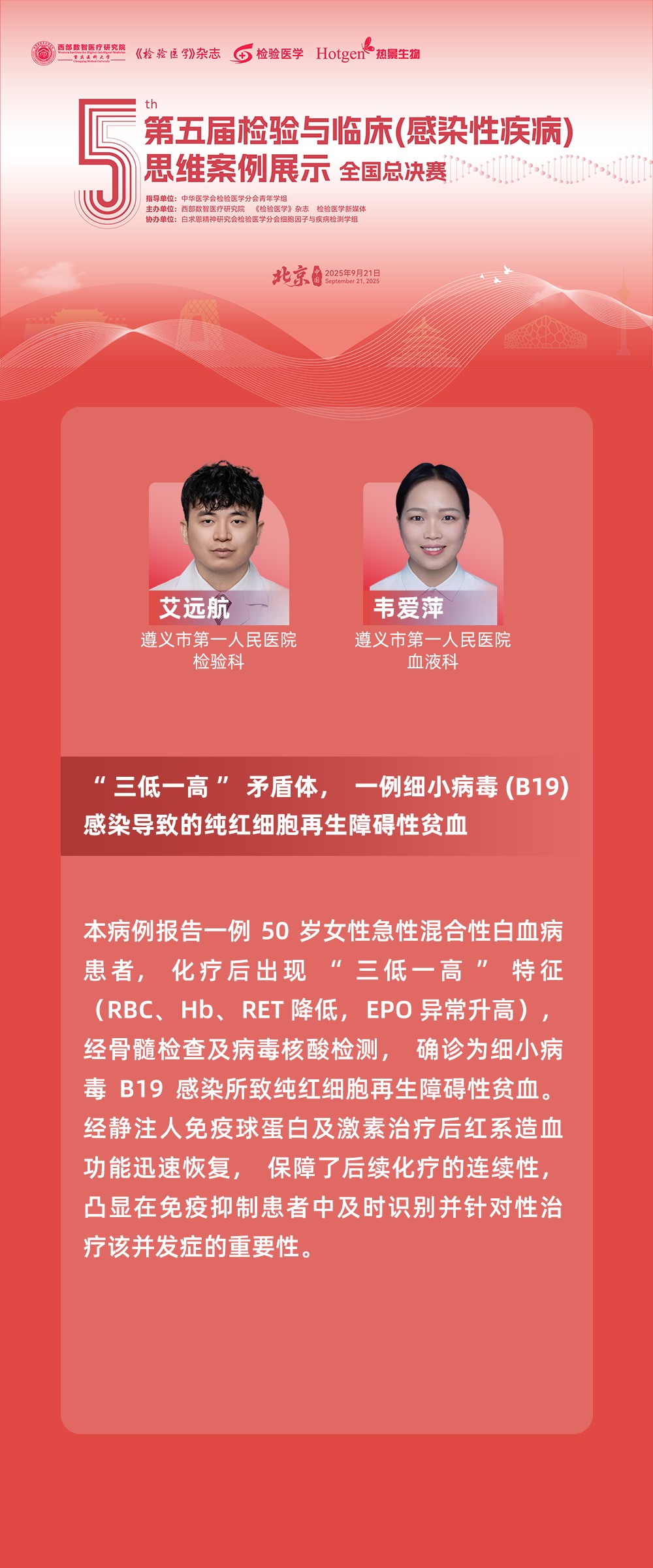 為了更有效地推進檢驗與臨床之間的溝通,促進跨學(xué)科交流與合作,實現(xiàn)檢驗與臨床的融合發(fā)展,在大會召開期間,舉辦了檢驗與臨床思維案例展示活動暨“2025年全國檢驗與臨床思維案例展示總決賽”。其中,由熱景生物支持的“第五屆檢驗與臨床(感染性疾病)思維案例展示全國總決賽”冠軍組案例,即來自遵義市第一人民醫(yī)院的《“三低一高”矛盾體,一例細小病毒(B19)感染導(dǎo)致的純紅細胞再生障礙性貧血》、重慶大學(xué)附屬三峽醫(yī)院的《NGS導(dǎo)航下的“糞”怒突圍——一例溺糞患兒感染的密碼破譯戰(zhàn)》案例入選“2025年全國檢驗與臨床思維案例展示總決賽”。